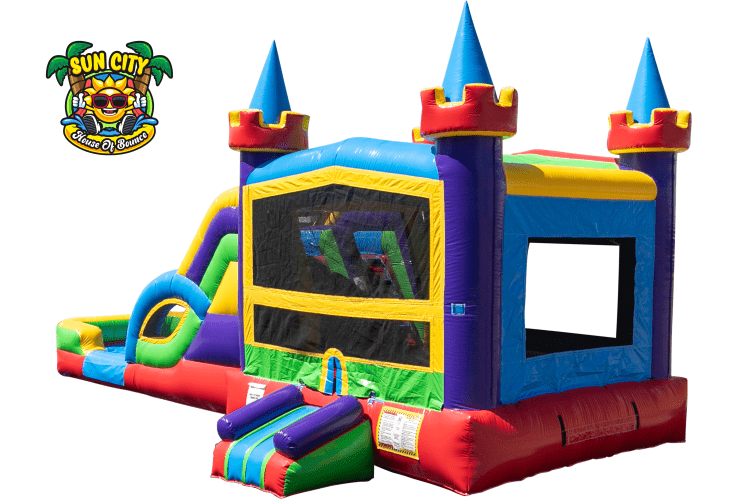 The mix of bold colors, tall turrets, mesh windows, and multiple play features makes it a great centerpiece for birthdays, school events, church gatherings, and family celebrations. Designed to keep the energy moving, this combo gives kids a chance to jump, climb, slide, and enjoy an exciting themed experience all in one inflatable.